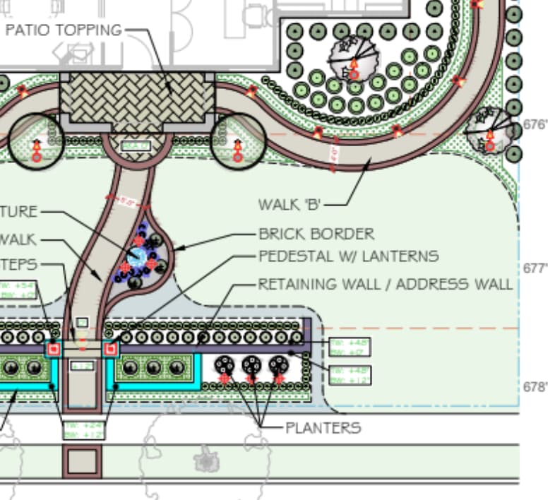 The hardscape layer defines the permanent built elements: patio surfaces, pool shell and coping, outdoor kitchens, cabanas, walkways, driveways, retaining walls, and structural features. The planting layer specifies every plant by species, mature size, placement, and spacing, with material call-outs so the installing crew is not guessing at substitutions. The grading and drainage overlay shows how water moves across the property — where swales and catch basins are needed, how the finished grade meets the existing one, and how runoff is directed away from the house. In North Texas clay soil, this layer is often the most technically demanding part of the plan. Our grading and retaining wall documentation is frequently the first set completed on new construction projects, because the house's finished floor elevation and the surrounding grade have to be coordinated before a foundation is poured.