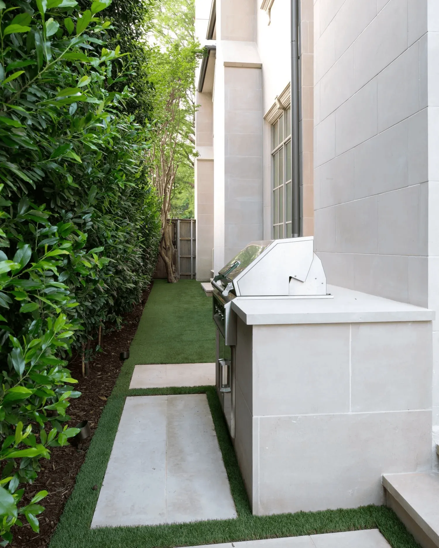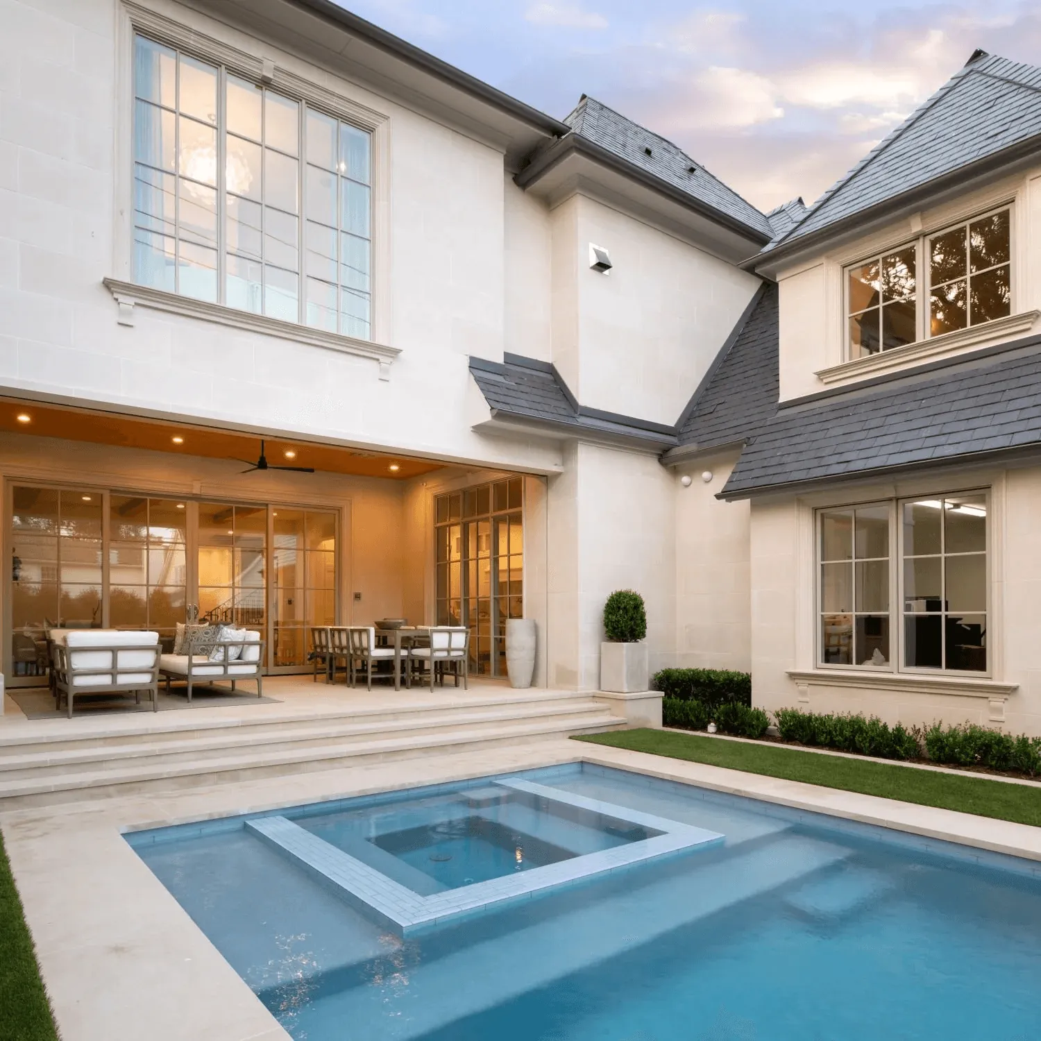 This Highland Park, Dallas, TX landscape design blends classic elements with modern outdoor luxury. A stately stone walkway framed by lush greenery and symmetrical planters creates a grand entrance with timeless curb appeal. In the backyard, a custom pool and spa with a cascading water feature wall offers a tranquil focal point, enhancing the space with sound and movement.