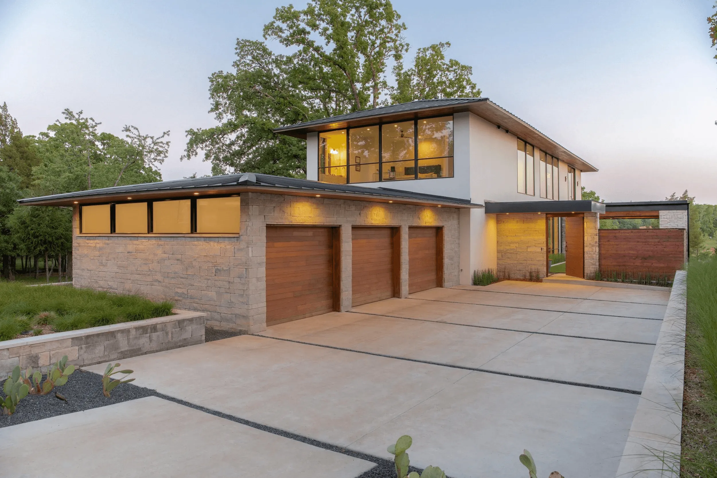 You arrive and the lake steals the first look—then the architecture keeps it. Tiered stone terraces step down the slope, pulling you toward the water like a runway to Cedar Creek. Under the cedar-lined canopy, a covered lounge with a modern fireplace becomes your year-round living room: evening breezes, shaded afternoons, and that soft glow after sunset. Custom furnishings sit low and clean; layered lighting warms the stone and wood so everything feels calm and camera-ready. Native, drought-tolerant plantings wrap the edges—easy care, big impact, and just enough privacy.